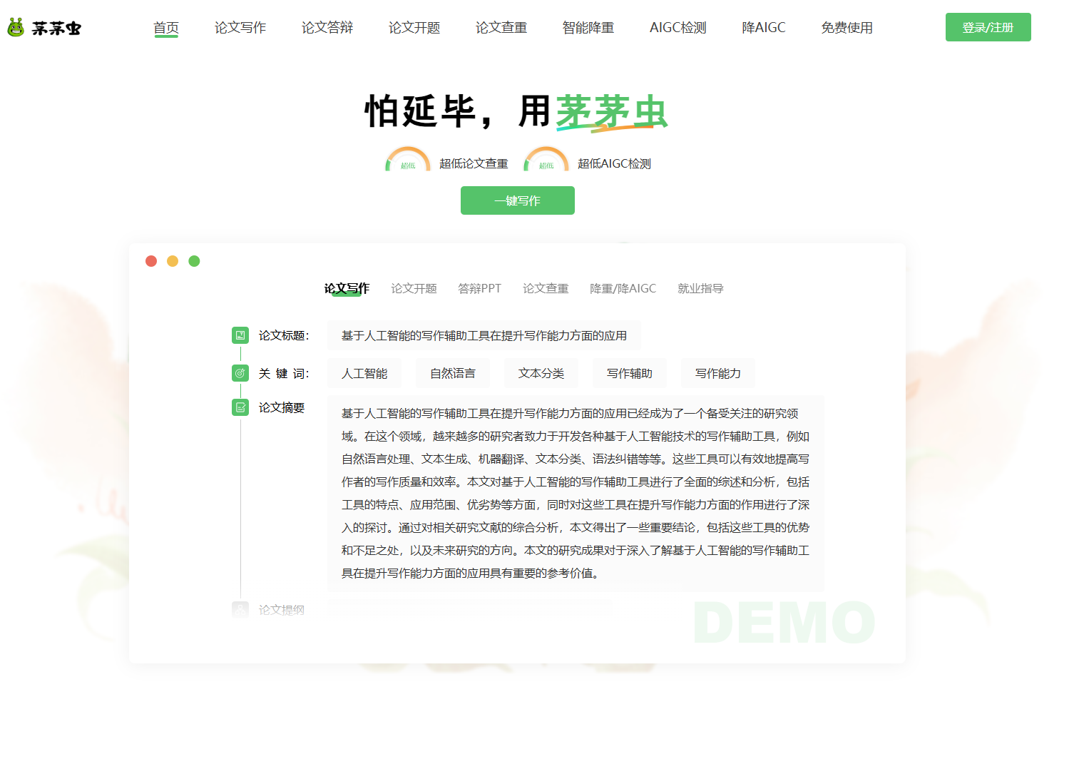 茅茅虫论文写作助手是一款全面的AI学术论文写作平台,为学术研究者提供了从论文构思到最终答辩的一站式服务,目标是让天下没有难写的论文。该的功能涵盖了学术论文写作的各个关键环节:论文写作辅助、论文开题指导、答辩PPT制作、论文查重服务甚至就业指导。